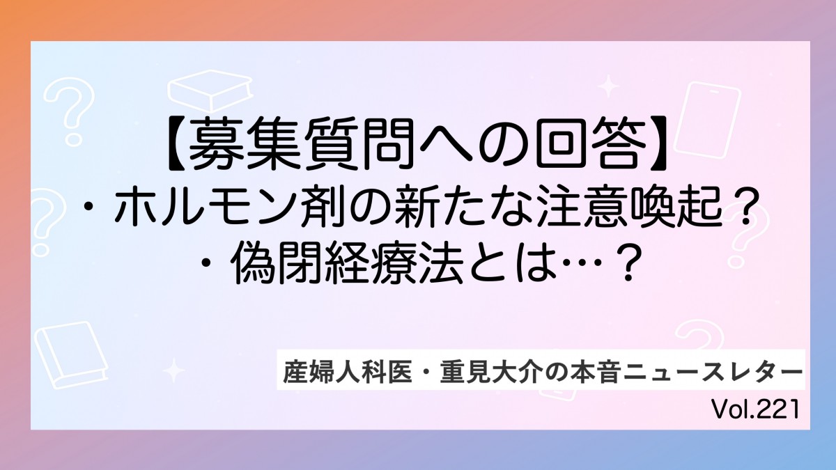 【募集質問への回答】ホルモン剤の新たな注意喚起、婦人科系検診の適切な頻度、偽閉経療法の副作用
