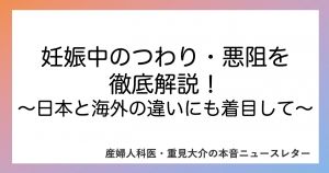 過去の記事に、つわりと妊娠悪阻に関する詳細や、日本と海外での治療法の違いなどをまとめているのでぜひそちらもご覧ください。